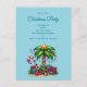 Carte postale de l'invitation de Noël avec une image de vacances saisonnière. Un palmier tropical orné de lumières festives surmonté d'une étoile. Un sucre de canne géant rouge et blanc qui sort du sable. Cadeaux de Noël sous l'arbre. Whimsical et amusant.