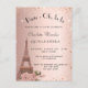 Une invitation moderne, élégante et glamour pour une Quinceañera, 15e anniversaire, thème parisien. Un arrière - plan métallique à l'aspect faux rose d'or avec des étincelles de parties scintillant et la tour Eiffel avec quelques fleurs. Le nom est écrit avec un script de style moderne écrit à la main. Personnalisez et ajoutez les détails de votre fête.