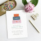 Une pile de valises colorées est posée en haut de ce carton d'invitation à une fête d'adieu fantaisiste. Sous l'illustration des bagages, il y a un espace pour le nom de l'invité d'honneur et les détails de la fête. Le verso du carton présente un motif à rayures diagonales coordonné. Cette invitation est parfaite pour quiconque est sur le point de se lancer dans une nouvelle aventure !