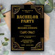 Invitez vos invités avec cette invitation de fête de bachelor sur le thème vintage Gatsby le Magnifique avec une bordure décorative dorée et une typographie élégante sur fond noir. Ajoutez simplement les détails de votre événement sur ce modèle facile à utiliser pour en faire une invitation unique. Retournez la carte pour révéler un beau motif de triangles dorés au verso de la carte.