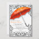 Cette élégante invitation pour une fête de mariage présente un grand parapluie orange avec de beaux coins décoratifs en forme de parchemin et des gouttes de pluie. Facile à mettre à jour avec vos détails.