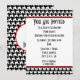 Une invitation simple avec un motif houndstooth en haut et en bas de la face avant. garniture rouge et police rétro. Personnalisez avec les détails de votre occasion. Le côté opposé présente un design uni avec une forme de cercle au milieu, encadrant le texte.