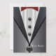 Modèle de carton d'invitation pour soirée ou événement habillé avec smoking noir élégant et classique, chemise blanche et nœud papillon rouge. Personnalisez et adaptez les côtés avant et arrière avec les informations de votre événement.