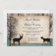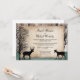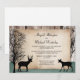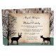 Cartes d'invitation pour une réception de mariage avec des cerfs, de style rustique et boisé, conçues exclusivement par Artistically Invited, avec des silhouettes d'un cerf avec des bois, une biche et des arbres d'hiver sur un fond en bois et un motif vert chasseur délavé en bas. Vos informations personnalisées sur le mariage et la réception sont imprimées sur une illustration de papier rustique en lambeaux. Ces invitations pour une réception avec des cerfs sont parfaites pour vos célébrations de réception de mariage post-mariage sur le thème de la forêt ou des cerfs.