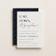 CASQUETTE, GOWN, ça baisse ! Invitation contemporaine à la fête de remise de diplômes. Design de typographie moderne sur des arrière - plans couleur ivoire et bleu nuit avec support motif géométrique faux or.