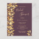 Une invitation botanique branchée à la douche nuptiale en cassis, violet profond. Décoré de feuillage et de sprigs de couleur faux or. Écriture manuscrite moderne à grande main, typographie avec le texte : Fête des mariées. Modèles pour que la mariée soit le nom et les détails du parti. Texte doré. Retour : arrière - plan couleur cassis. Conseil : Si vous ne voulez pas qu'il ressemble à une carte postale, cliquez sur customiser, allez à l'arrière et retirez le séparateur et le timbre postal.