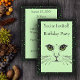 Cette invitation à la fête a un croquis d'un visage de chat avec des yeux verts et de longs murmures sur un arrière - plan vert clair avec une bordure noire avec des pois vert foncé vibrants. Customisez vos informations à l'avant et à l'arrière avec les modèles.