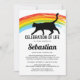 Invitation au service funéraire de chats avec un simple fond blanc, un pont arc-en-ciel coloré, une silhouette d'un chat, et une célébration de la vie modèle facile à personnaliser.