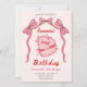 Célébrez dans le style vintage avec notre charmante arc rose et invitation d'anniversaire de gâteau! Au coeur de l'invitation se trouve un gâteau d'anniversaire rose et rouge ludique, avec un cadre d'arc de style rétro rose. La police de style machine à écrire et le texte rouge flirtant créent une ambiance nostalgique à la fois intemporelle et amusante.