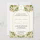 Personnalisez nos belles invitations traditionnelles de mariage catholique avec des anneaux de mariage d'or entrelacant un crucifix doré sur une croix mariale / Symbole blanc et or design floral. L'arrière - plan ivoire et tous les textes et polices peuvent être modifiés.