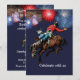 C'est une invitation recto-verso avec un cowboy chevauchant un cheval bucking sur le devant avec des feux d'artifice en arrière-plan et de nombreux champs de texte au dos pour remplir les détails de votre fête. Le numéro d'âge est censé ressembler à une marque sur la hanche du cheval.
