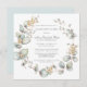 Des fleurs blanches élégantes nichées au milieu d'un feuillage d'eucalyptus bleu poussiéreux forment une couronne boho insouciante autour de votre Célébration d'un détail de vie. Le dos est bleu roux. Tout le texte peut être facilement édité pour créer un souvenir personnel.