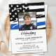Mémorial de la Fête de la Vie de la Police de la Ligne Bleue Mince dans un drapeau américain moderne drapeau de la police couleurs drapeau. Personnalisez cette célébration du mémorial de la police de l'invitation à la vie avec la photo de votre policier, le nom et les dates et les sentiments, et les détails de l'événement. Cette célébration funéraire de la vie par les forces de l'ordre sera un trésor. Parfait pour des funérailles de police, des funérailles d'application de la loi, un service commémoratif de police ou une célébration de la vie de la police. Dans Loving Memory Police Mémorial Mince Ligne Bleue Drapeau. DROIT D'AUTEUR © 2020 Judy Burrows, Black Dog Art - Tous droits réservés. Fête De La Police De La Vie Mince Ligne Bleue Mémorial Invitation