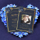 Un arrière - plan bleu marine, un faux cadre doré. Décoré de fleurs bleues, de fleurs aux fleurs. Personnalisez et ajoutez le nom, les dates et votre texte. Ajoutez une photo à l'arrière.