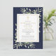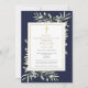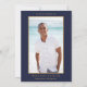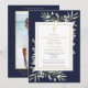 Une élégante invitation de célébration de vie personnalisée avec un rappel photo funéraire comportant une végétation botanique à l'aquarelle sur un fond bleu marine. Conçu par Thisisnotme©