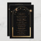 Celestial Black Gold QR Code Quinceañera Invitations dispose d'un élégant soleil doré, lune et étoiles avec un cadre doré sur un arrière - plan noir. À l'intérieur est votre Quinceañera personnalisée d'informations d'invitation. Au verso, ajoutez des informations supplémentaires telles que votre site Quinceañera et votre code QR. Personnalisez en modifiant le texte dans les zones de texte. Conçu pour vous par Evco Studio www.zazzle.com/store/evcostudio