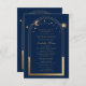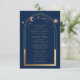 Celestial Blue Gold QR Code Quinceañera Invitations dispose d'un élégant soleil doré, lune et étoiles avec un cadre doré sur un arrière - plan bleu. À l'intérieur est votre Quinceañera personnalisée d'informations d'invitation. Au verso, ajoutez des informations supplémentaires telles que votre site Quinceañera et votre code QR. Personnalisez en modifiant le texte dans les zones de texte. Conçu pour vous par Evco Studio www.zazzle.com/store/evcostudio