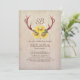 Invitation de fête de bébé rustique de campagne d'été ou d'automne avec des bois de cerf, des fleurs de bébé's breath blanches, un fond en bois et un bouquet de tournesols.