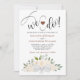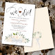 Cette invitation de mariage romantique et élégante présente une aquarelle rustique design floral avec un ensemble de roses peints à la main et des fleurs dans les tons de pêche au champagne ou de blush pâle avec le feuillage et la verdure feuille d'eucalyptus. En haut se trouvent les mots : "nous le faisons !", épelés dans un script moderne en lettres avec un coeur mignon entre eux. L'arrière de l'invitation est d'une couleur pêche très pâle avec un bouquet de fleurs et un feuillage attaché avec un arc en satin.