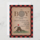 Invitation de baby shower de bûcheron à bois illustrant l'illustration d'un disque de bois incorporé dans le texte "BOY" avec l'illustration d'une souche d'arbre avec hache au fond. Arrière - plan est cardstock inspiré de la bordure rouge et noir de buffle plaid.