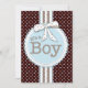 Un design sucré de rayures et de pois motifs dans les tons mignons de bleu bébé et moka doux, sur un arrière - plan de chocolat riche. Un effet de superposition délicieux est utilisé pour créer un look scrapbook aux deux côtés de l'invitation. Tous les éléments sont plats et font partie de l'image graphique, mais ont une illusion de profondeur qui donne un intérêt visuel à l'aspect général. Le design de l'arc et du ruban en bleu et blanc permet aux clients d'être sûrs qu'un petit garçon est sur le chemin - et tout le texte sur le dos peut être customisé pour répondre à vos besoins.