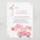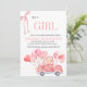 Cette charmante invitation au baby shower célèbre l'arrivée d'une petite fille au design chaleureux et fantaisiste. L'expression "IT'S A GIRL" occupe le devant de la scène dans une police de corail élégante et douce, associée à une illustration décorative en ruban pour une touche de sophistication. Ci-dessous, les détails personnalisés de l'événement sont soigneusement arrangés dans une police gracieuse pour une lisibilité facile. Le fond présente une adorable illustration d'une voiture rouge vintage portant un paquet de ballons roses en forme de coeur, évoquant la joie et la fête. L'ensemble allie chaleur, élégance et ludique, ce qui en fait un lieu idéal pour une célébration spéciale.