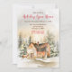Cette belle et festive invitation de vacances en aquarelle dispose d'un chalet d'hiver rustique entouré de neige et d'arbres. Il y a d'adorables animaux, comme un orignal et un chien coquin, et aussi du feuillage. Le texte combine écriture manuscrite et polices sans serif pour un look élégant et moderne. C'est parfait pour une fête d'hiver ou de Noël.