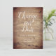 Ce simple changement rustique de notre carte de date comporte un élégant changement de date de script au-dessus de vos détails, mis en typographie élégante sur un arrière - plan de panneaux de bois rustique. Le verso contient des détails supplémentaires, y compris votre site Web, avec votre adresse de retour et l'espace pour l'adresse de votre destinataire. Conçu par Thisisnotme©