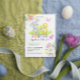 Allez au printemps avec cette adorable invitation de Pâques ! Doté d'un mignon lapin et d'un poussin tenant des oeufs de Pâques, entouré de motifs floraux colorés d'aquarelle en jaune, rose, vert, violet, bleu et orange. Invitations amis et famille à votre chasse aux oeufs de Pâques et Brunch avec cette carte charmante et personnalisable. Parfait pour une fête joyeuse. Veuillez me contacter pour toute aide ou assortiment de produits.