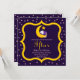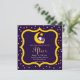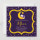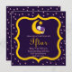 Des Invitations viennent célébrer l'Iftar ou l'Aïd pendant le Ramadan. Design propose un chat sucré avec une couverture violette dormant sur une lune jaune croissant avec étoile. Bordure violette et dorée avec étoiles roses.