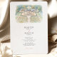 This two-sided fine-art wedding invitation showcases a hand-painted watercolor illustration of a French château and its formal gardens, inspired by the elegant Château de Villette near Paris. On the front, an aerial view reveals the grand house at the center of sweeping parterre gardens, tree-lined paths, and classical fountains, all outlined with delicate ink line work and washed in soft tones of buttery stone, muted green, and sky blue. The illustration sits above a clean, centered layout of the wedding wording in sophisticated serif type with a subtle script accent, creating a refined, European estate feel.