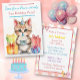 Adorable Anniversaire Invitations Fête. Cela peut être pour un 1er anniversaire ou vraiment n'importe quel âge peut être customisé dans la zone personnalisée. Un chaton d'aquarelle douce tenant un cupcake entouré de cadeaux d'anniversaire. Coloré avec violet, bleu, rose, jaune, orange et vert.