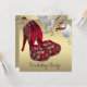 Modèle d'invitation à une fête d'anniversaire élégante chaussure à talon haut rouge et or. Cette belle invitation de fête rouge et or est facilement personnalisable pour votre événement en choisissant simplement le bouton "Personnalisez-le !" pour commencer à ajouter les détails de votre événement, le style de police, la taille et la couleur de la police, ainsi que le libellé. Veuillez noter que tous les autocollants, cartes et modèles d'invitation que vous trouverez sur Zazzle sont des graphiques imprimés sans véritables bijoux, rubans, reliefs, gaufrures ou pièces ajoutées. com