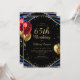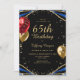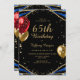 Invitation de 65e anniversaire chic avec parties scintillant en faux or, tourbillons en marbre d'agate bleu, ballons de parties scintillant rouge et or et élégant script de calligraphie. Facile à personnaliser pour célébrer la personne qui a 65 ans.