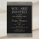 Annoncez votre événement avec style avec cette invitation chic et élégante à la fête. Un design inspiré de la mode, avec le motif emblématique en houndstooth, associé à des rayures contrastées et à la typographie classique. Parfait pour organiser une fête d'anniversaire, un anniversaire, un dîner, un déjeuner ou un cocktail ! Couleurs : noir et blanc cassé. Disponible sous forme d'invitation imprimée ou de téléchargement numérique.