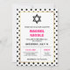 Ces invitations chic et élégantes seront parfaites pour le Bat mitzvah de votre fille. Un motif à pois noir et blanc branché compose l'arrière - plan, et un cadre en feuille d'or faux est au centre. Il y a aussi une étoile de David, et votre libellé est en rose et noir moderne. Le dos de la carte est rose assorti.