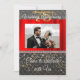 Une invitation élégante noire et dorée avec un ruban de soie rouge présente la photographie du couple.
