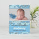 Bleu, blanc et marron avec des tourbillons à pois et la photo du bébé pour le baptême du garçon.