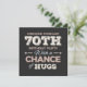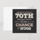 Citation de citations drôles pour les 70 ans avec une phrase humoristique comme Prévisions de week-end Fête des 70 ans avec une chance de câlins. Joyeux 70e anniversaire pour célébrer l'anniversaire de vos proches, par exemple votre grand-mère, grand-père, père, mère, oncle ou tante. Idée cadeau pour les 70 ans.