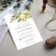 Faire-part de mariage botanique moderne et tendance, avec une branche de citrons et de feuilles dans une palette sophistiquée de jaune doux et de vert d'olive. La couleur arrière - plan inverse est décorée d'un motif homogène de citrons coordonnés et de feuillage, faire-part de mariage claire et aérée, parfaite pour la mariage d'inspiration méditerranéenne ou pour un mariage à la campagne.