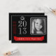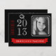 Invitation à la fête de graduation recto verso avec des espaces réservés pour une photo. Plusieurs champs de texte personnalisables au verso avec une grande marge de manoeuvre vous permettent de le personnaliser complètement en fonction des détails de votre événement. Un design simple rouge et noir avec un ruban rouge et un texte rouge, une zone modèle photo encadrée, un clipart d'obturation et un grand lettrage de style tracé.