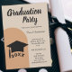 Faites passer le mot et donnez le ton de leur élégante fête de la grade ! Cette carte d'invitation de graduation dispose d'un modèle texte personnalisable avec un style classique moderne utilisant une arche et des couleurs en terre cuite, bronzage neutre et noir. Il y a une illustration d'une casquette noire de graduation avec un moule. Conception par Ms_Jade. © Ms_Jade
