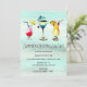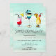 Trois cocktails d'été décorent le sommet de cette invitation à la soirée cocktail d'été. Le cocktail à gauche est rose avec un parapluie jaune. Le cocktail sur la droite est jaune et garni d'une tranche de cerise et d'ananas. Une boisson turquoise, avec parapluie bleu, occupe la scène. Un lavage à l'aquarelle bleu doux est l'arrière - plan parfait pour l'avant et l'arrière de votre invitation à cocktail. Summer Fun est écrit dans une police lunatique. Les détails de votre fête suivent.
