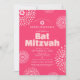 Soyez fiers, réjouissez-vous et mettez en valeur ce jalon de votre Bat Mitzvah préférée avec cette invitation QR code personnalisée, amusante, tendance et funky ! Des éclats d'étoiles floraux rétro pop blanc et rose blush avec des étoiles de David, ainsi qu'une typographie sans serif moderne rose blush et blanche, se superposent sur un fond rose corail vif. Au verso, la photo de votre choix, un éclat d'étoile floral rose vif et un code QR scannable pour plus d'informations se superposent sur du blanc. Personnalisez le texte personnalisé avec le nom de votre Bat Mitzvah, la date, les informations sur le lieu, l'URL du site web et la photo. Garantit d'ajouter une touche de style amusant à son occasion spéciale !