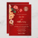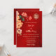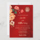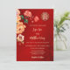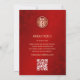 Fleurs de pivoines rouges, oranges et jaunes avec un arrière - plan chatoyant rouge. Faire-part de mariage chinoise avec un double symbole de bonheur en or. Modifiez le code qr à l'arrière en ajoutant votre URL de votre site Web mariage.