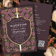 Invitation vos invités mariages avec cet Imaginaire médiéval Royal Sword & Shield Invitation Monogramme avec des fleurs violettes et un arrière - plan mauve. Ce design est parfait pour les couples à la recherche d'une esthétique d'imaginaire médiéval royale mais moderne. Personnalisez le texte, la police et les couleurs en fonction de vos préférences de conception. Objets correspondants dans notre boutique pour un thème de fête complet. REMARQUE : L'or présenté dans ce design n'est PAS un vrai papier peint.
