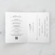 Classic tout en un faire-part de mariage plié avec un design noir et blanc simple et minimal avec une combinaison de polices serif traditionnelles et un script élégant avec votre date dans un grand format pour une touche moderne. Le panneau intérieur gauche contient vos détails supplémentaires. Utilisez le modèle pour générer un code QR ou le supprimer dans l'outil d'édition de conception. Le panneau de droite intérieur contient votre carte RSVP. Cette élégante invitation de mariage est idéale pour un mariage formel.