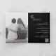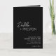 Faire-part de mariage pliée noire moderne avec un design simple et minimal avec le nom de la mariée dans un script élégant et le nom du marié dans une police sans serif contemporaine. Vous trouverez ci-dessous, dans le coin inférieur droit, les détails de votre événement dans un agencement minimaliste. L'intérieur a votre photo préférée et vos détails supplémentaires, y compris un code QR optionnel (si vous préférez, le code QR peut être supprimé dans l'outil d'édition de conception). Le verso comporte deux sections facultatives supplémentaires pour plus d'informations.