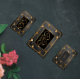 Une invitation de mariage noire et or élégante combinant des cœurs en or et des cadres rectangulaires sur fond noir. J'ai choisi le papier à colonnes pour mettre en valeur cette invitation. Il y a une carte 'Save the Date' et une carte de réponse pour accompagner cette invitation, ainsi que quelques accessoires.