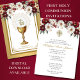 Célébrer le sacrement de la première sainte communion est une occasion merveilleuse. Cette traditionnelle invitation à la première communion vintage traditionnelle catholique avec des fleurs bordeaux et blanches, un Chalice d'or et la Sainte Eucharistie sera sûr d'express la beauté et la solennité de cette journée spéciale. Tous les textes et polices peuvent être facilement modifiés.